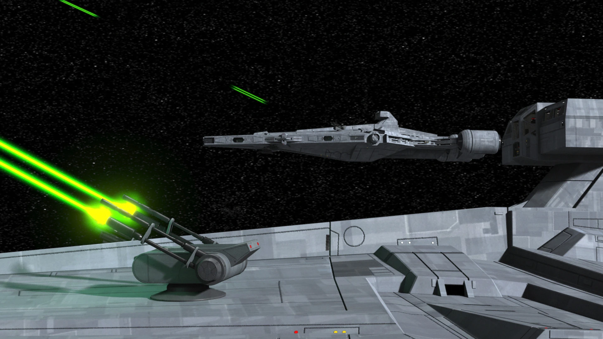Etwas später versuchte ein Leichter Kreuzer über Garel die Broken Horn abzufangen, da diese unerlaubt einen imperialen Kontrollpunkt passiert hatte. Trotz Treffer der beiden obenen Vierlingsgeschütze konnte der Transporter in den Hyperraum fliehen.[25]