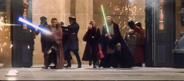 Padmé wird kurz bevor sie den Vizekönig verhaften kann von einigen Droiden überrascht und ergibt sich mit ihrem Gefolge.