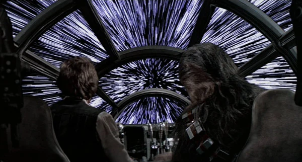 Ein Hyperraumsprung aus der Cockpitsicht des Millennium Falken.