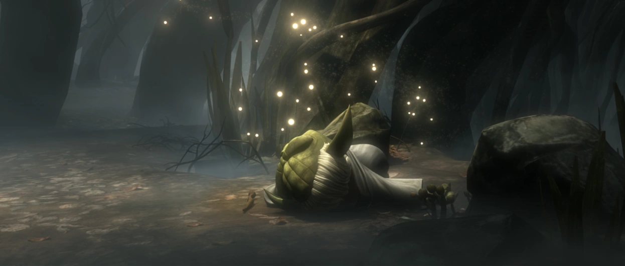 Auf Dagobah angekommen, landete Yoda im dichten Wald der Welt. R2-D2 im Schiff zurücklassend, machte er sich auf den Sumpf zu erkunden. Schließlich vernahm er erneut die Stimme von Qui-Gon Jinn und folgte ihr. Plötzlich erschienen mehrere kleine Lichtpunkte und umkreisten Yoda spielerisch. Diesen Lichtern folgte der Großmeister. Auf seinem Weg, erfuhr er vieles über Jinns Einblicke in die Macht. Laut den Erklärungen des Toten, war er eine Manifestation der kosmischen Macht, in welche alles Leben nach dem Tod hineinfloss. Ihm war es gelungen, den Weg in die Welt der Lebenden zu finden, um das Wissen der Jedi an jüngere Generationen weiterzugeben.[4]