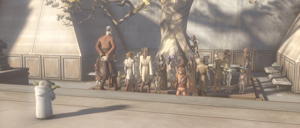 Die beiden traten auf die Terrasse des Tempels und erblickten dort eine große Menge versammelter Jedi, darunter Quinlan Vos, Saesee Tiin, Mace Windu, Ahsoka Tano, Gungi, Tera Sinube, Aayla Secura, Anakin Skywalker, Kit Fisto, Eeth Koth, Ganodi, Ran Deezy, Zatt, Byph, Tiplar, Ki-Adi-Mundi, Shaak Ti, Adi Gallia, Barriss Offee und Knox, etwas abseits der Gruppe befanden sich lachend Obi-Wan Kenobi, Qui-Gon Jinn und Dooku, welchen Yoda zuerst übersah. Er ging auf sie zu und entdeckte den Grafen. Yoda nahm sofort die Angriffsstellung ein, da er annahm, dass Dooku auf der Seite der Konföderation unabhängiger Systeme stand, doch dem war nicht so. Yoda erblickte den Jedi-Orden in einem Zustand der Reinheit und Ruhe, welche er sich immer gewünscht hatte. Dooku unterdessen erzählte von einer Geschichte, in welcher er als Yodas Padawan auf der Dschungelwelt Kashyyyk gegen einen Terentatek gekämpft hatten und rief gleich danach die gesammelten Jedi auf, sich unter einem alten Baum zu treffen. Selig vor Glück folgte Yoda, doch sein Verstand siegte: Er stoppte, kurz bevor zu den versammelten Jedi trat. Yoda hatte durchschaut, dass er eine Vision vor sich hatte und dass er geblendet von seiner Freude und von seinem Glück einen Fehler begangen hatte. Aufgrund seiner Reaktion veränderten sich die gegenüber dem Zorn der Jedi, blieb Yoda starr stehen, selbst als Dooku mit seinem Lichtschwert zu einem tödlich Schlag ausholte. Der Jedi-Meister und spätere Sith vollendete diesen und Yoda fand sich wieder in der realen Welt, die Prüfung hatte er durch sein Entsagen der Emotionen bestanden.[3]