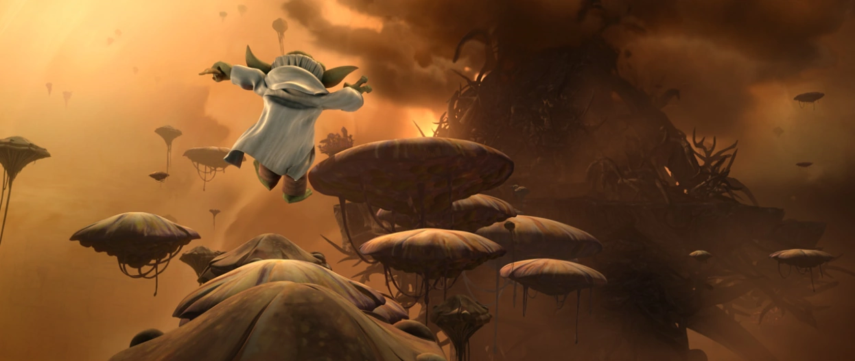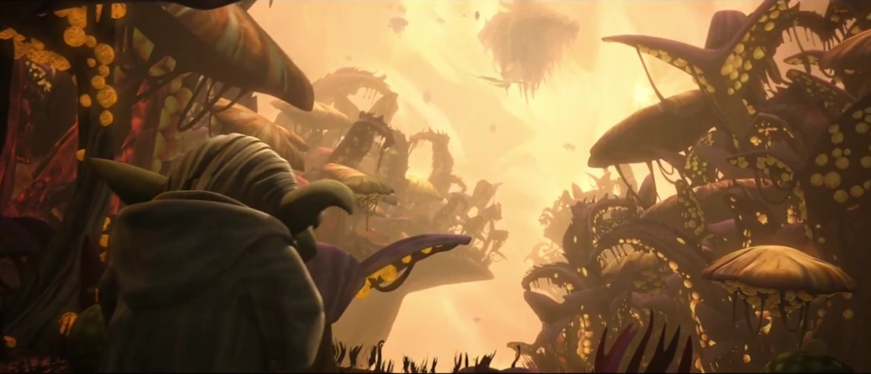 Nach einer Raumfahrt unbekannter Länge, erreichte der Großmeister einen strahlend hellen Nebel, welcher den gesamten Raum vor ihm ausfüllte. Von der Macht geführt, steuerte Yoda direkt darauf zu. Er trat in den Nebel ein und auf einmal spielten seine Instrumente verrückt und ließen sich nicht mehr manuell steuern. Selbst der Astromechdroide R2-D2 wurde durch die Reise durch den Nebel deaktiviert. So überließ Yoda das Schiff sich selbst und wartete mit geschlossen Augen meditierend bis er einen unbekannten Planeten erreichte. Dieser wirkte aus dem All kahl, aber strahlend helle Geysire reichten bis in den Weltraum. Im Krater eines solchen landeten Yoda und R2, welcher nun wieder funktionstüchtig war. Yoda stieg aus und begutachtete den Geysir und beschloss in den Geysir einzudringen, diese Fahrt trat er jedoch ohne seinen Droidenfreund und sein Lichtschwert an. Sein Schiff selbst steuernd, senkte er dieses in den Krater ab und sofort umschlossen ihn hellste Fäden des Geysirs.